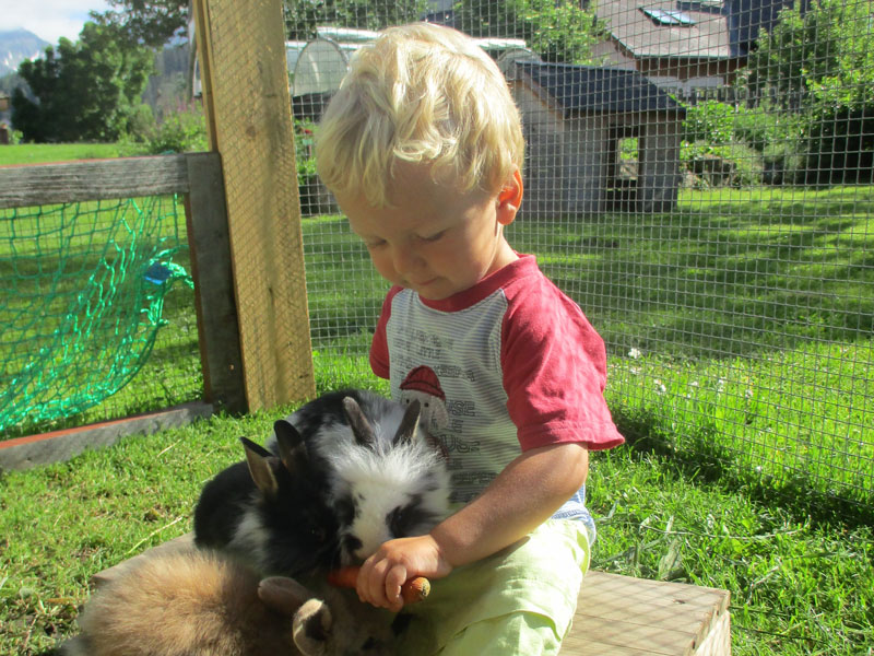 ... und im Anschluss an die gemeinsame gesunde Jause besuchen wir die Tiere am Bauernhof. Wir werden den tiergerechten Umgang erlernen, in dem wir sie versorgen, sie streicheln, mit ihnen kuscheln,… und viele Erfahrungen mit allen Sinnen machen.